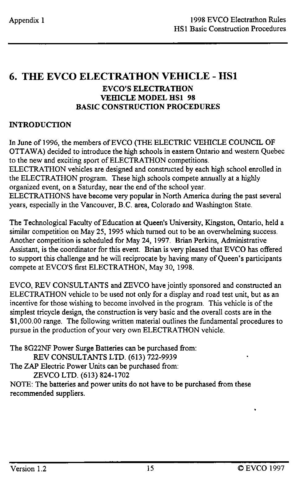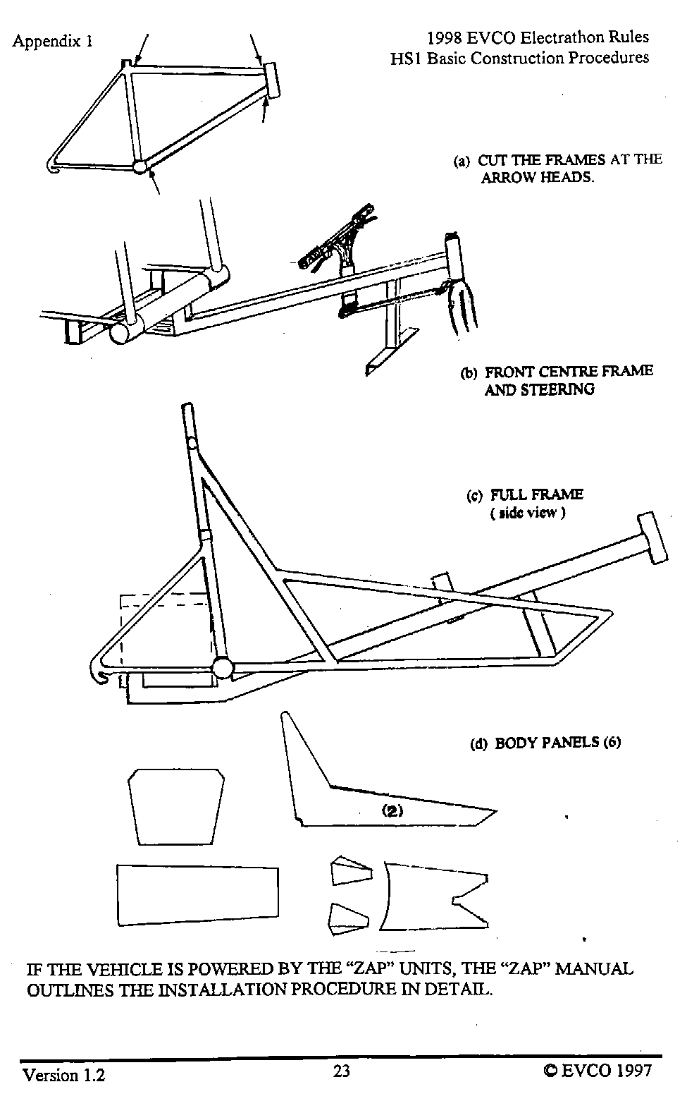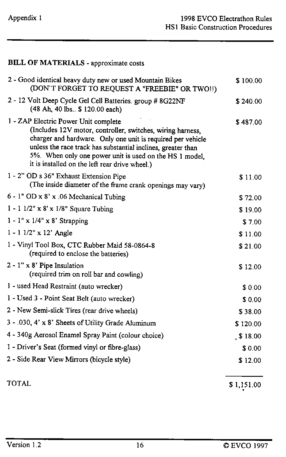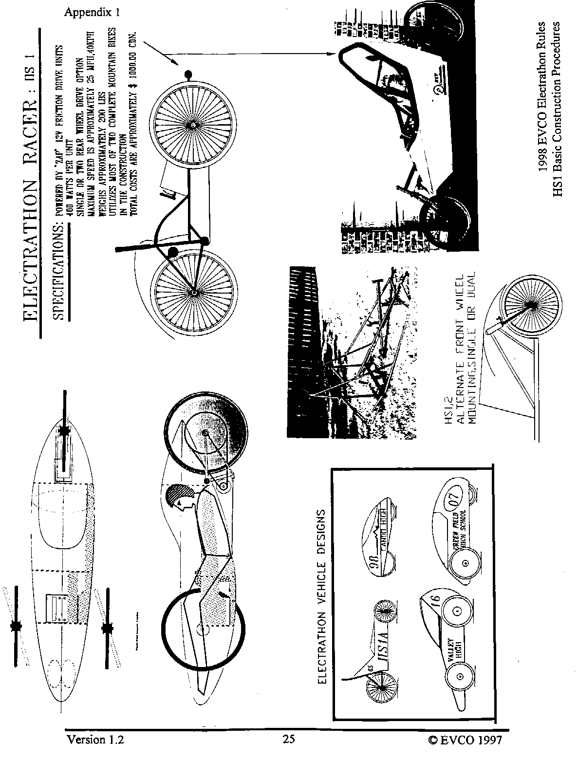 The following pages provide an introduction to the HS-1, a list of materials with costs as of late 1997 when the vehicle was built, and instructions as to how it was built. This vehicle, and these plans, were intended as a guide as to how to build a simple, reliable Electrathon vehicle that would acquit itself respectably - not necessarily an event-winner. You are welcome to read, use and copy these instructions for your own use. This material is copyrighted by the Electric Vehicle Council of Ottawa. If you wish to provide this information to others, please refer them to this website, and they too can read, use and copy this information for their own use. Any other use of this material without express written permission from the Electric Vehicle Council of Ottawa constitutes a violation of copyright.