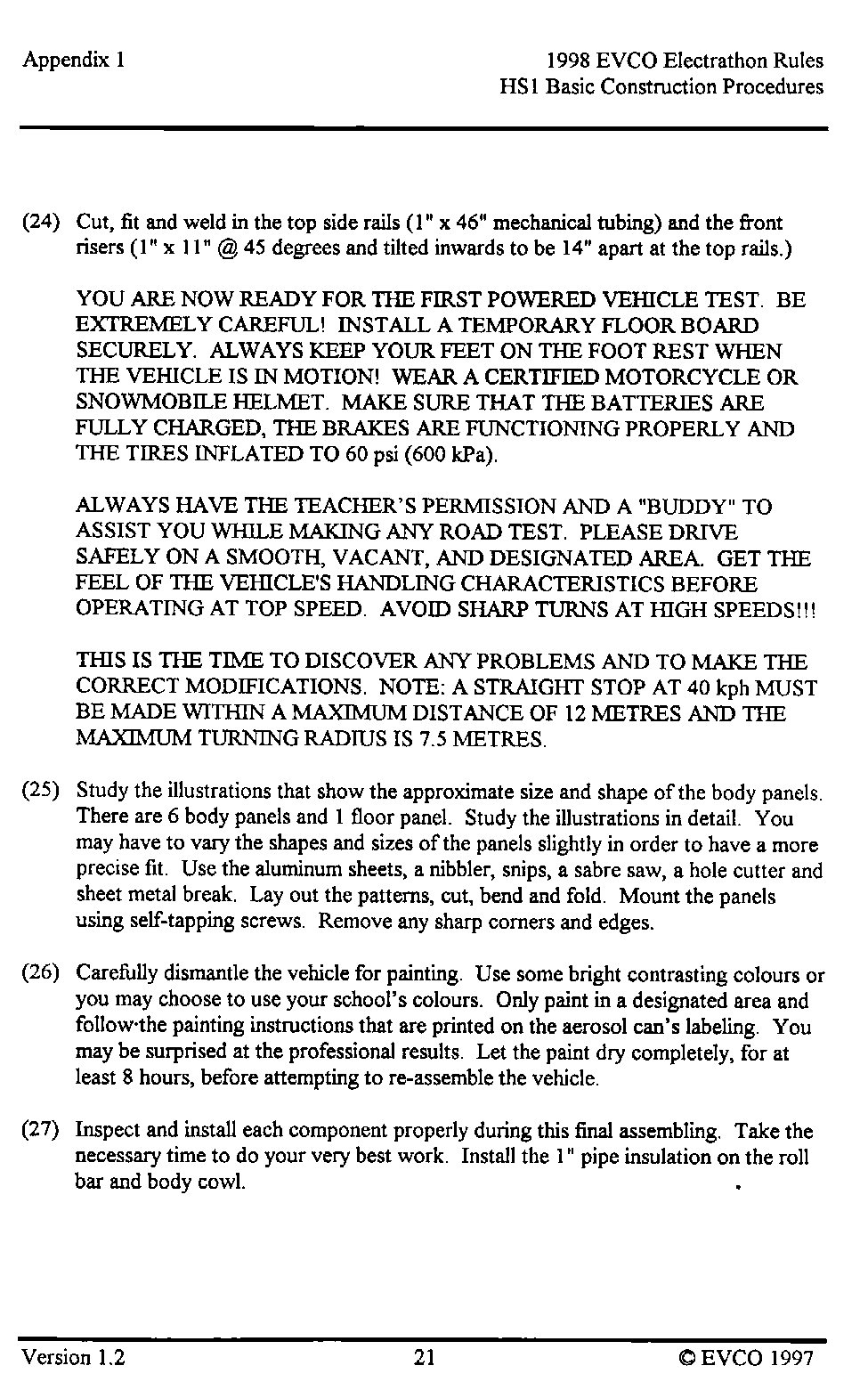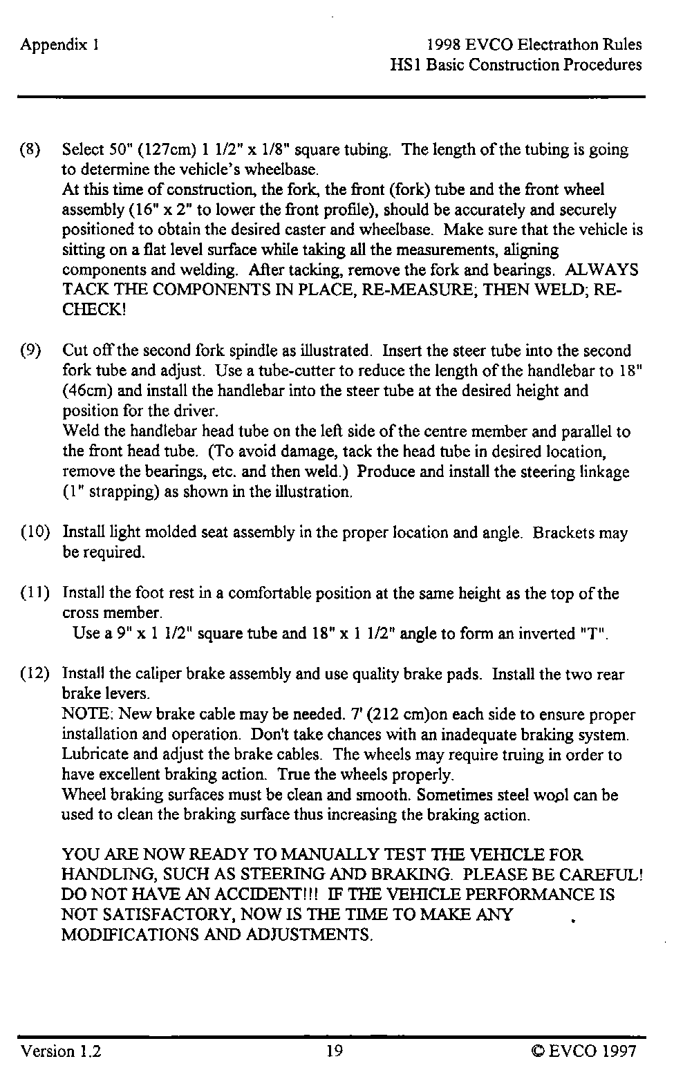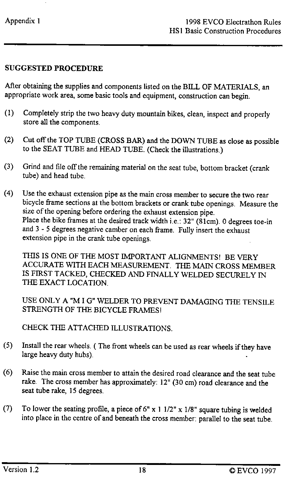 The following pages provide an introduction to the HS-1, a list of materials with costs as of late 1997 when the vehicle was built, and instructions as to how it was built. This vehicle, and these plans, were intended as a guide as to how to build a simple, reliable Electrathon vehicle that would acquit itself respectably - not necessarily an event-winner. You are welcome to read, use and copy these instructions for your own use. This material is copyrighted by the Electric Vehicle Council of Ottawa. If you wish to provide this information to others, please refer them to this website, and they too can read, use and copy this information for their own use. Any other use of this material without express written permission from the Electric Vehicle Council of Ottawa constitutes a violation of copyright.