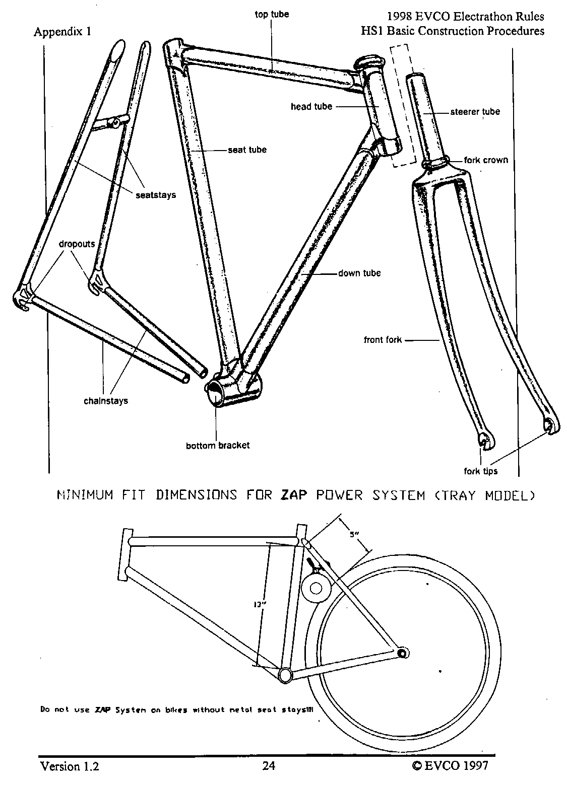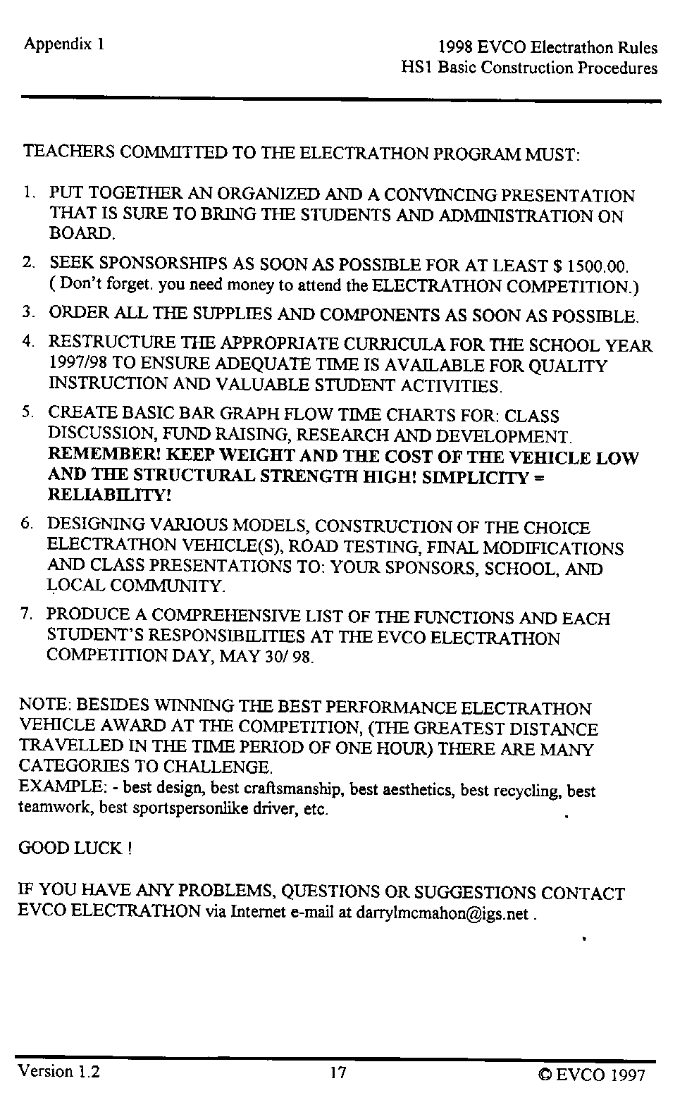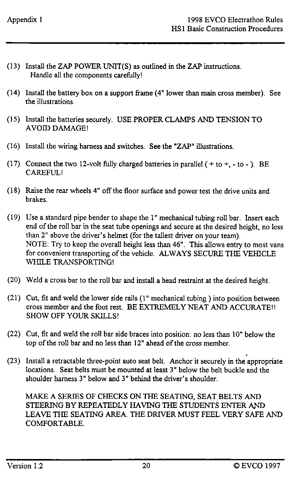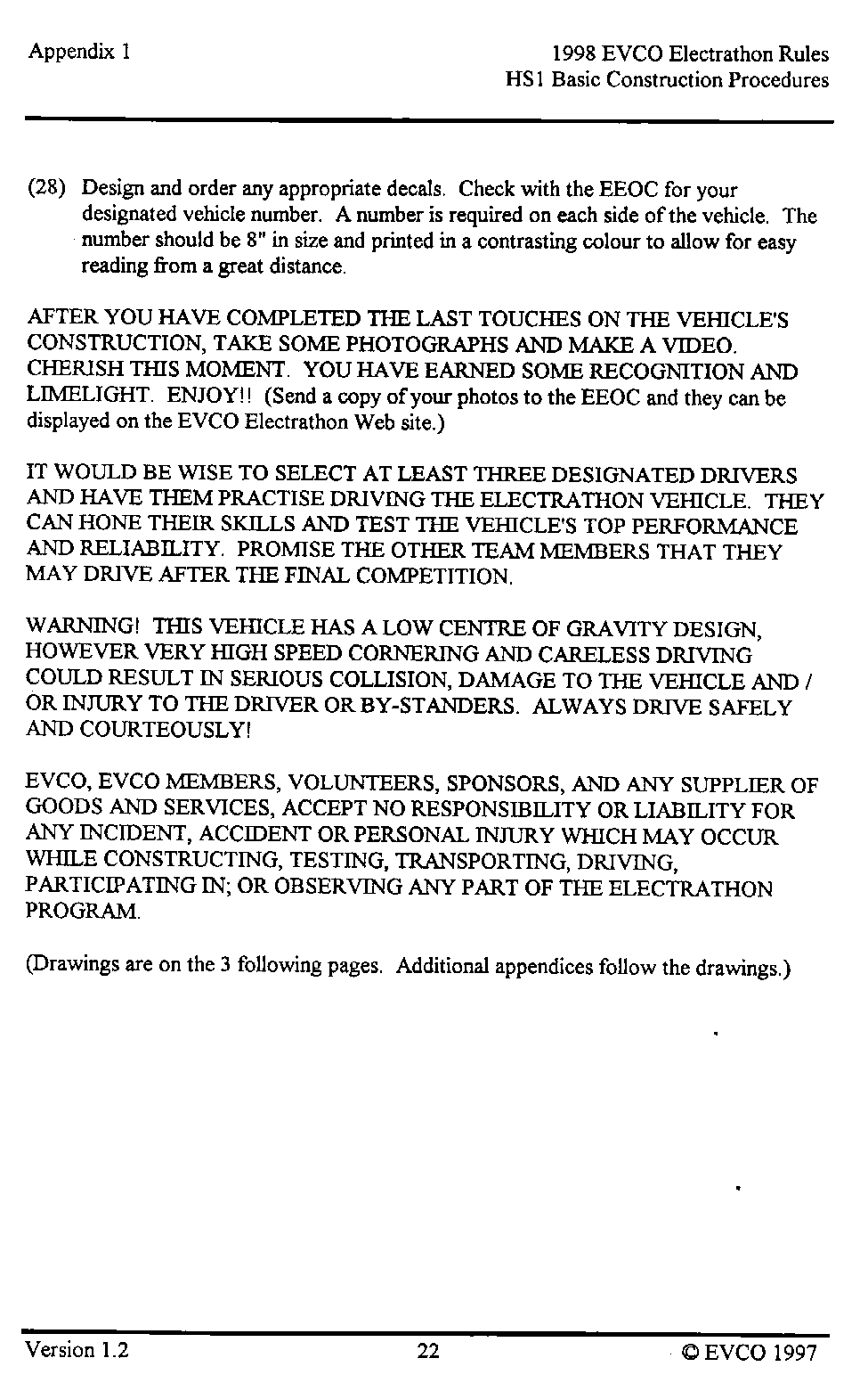 The following pages provide an introduction to the HS-1, a list of materials with costs as of late 1997 when the vehicle was built, and instructions as to how it was built. This vehicle, and these plans, were intended as a guide as to how to build a simple, reliable Electrathon vehicle that would acquit itself respectably - not necessarily an event-winner. You are welcome to read, use and copy these instructions for your own use. This material is copyrighted by the Electric Vehicle Council of Ottawa. If you wish to provide this information to others, please refer them to this website, and they too can read, use and copy this information for their own use. Any other use of this material without express written permission from the Electric Vehicle Council of Ottawa constitutes a violation of copyright.